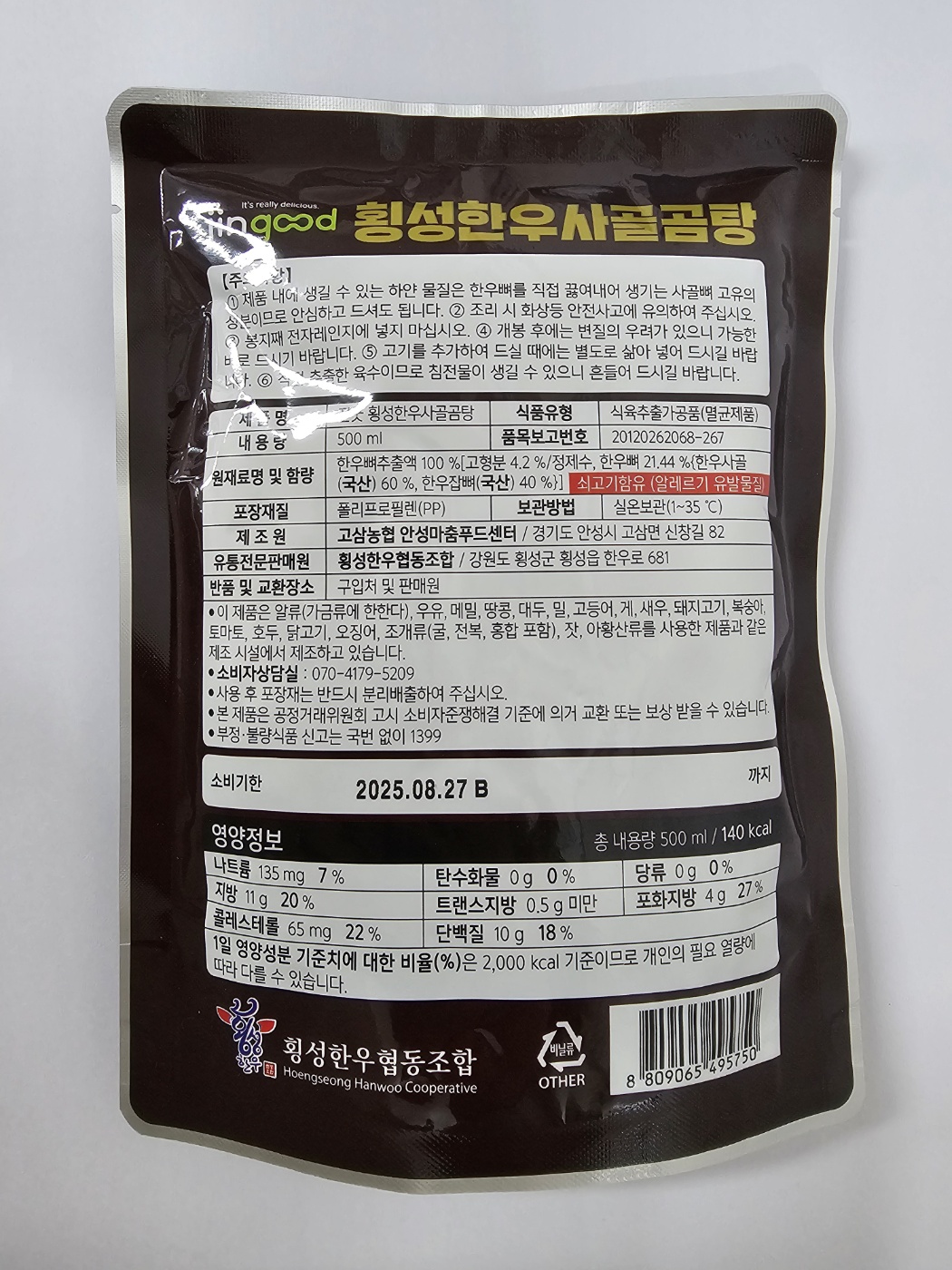 | 원재료명 및 함량 | 한우뼈추출액100%[고형분4.2%/정제수,한우뼈21.44%{한우사골(국산)60%,한우잡뼈(국산)40%} |